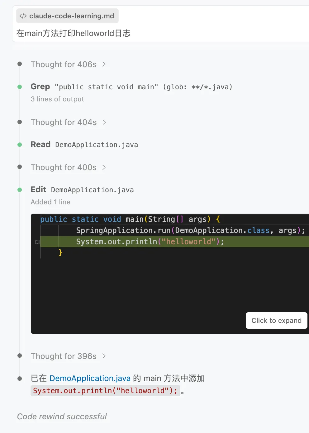 有时候因为理解或者与AI沟通交互上的偏差,导致任务错误的推进,生成不符合预期的代码,对此我们可以直接通过rewind指令进行回滚到上一轮对话的工程上下文。