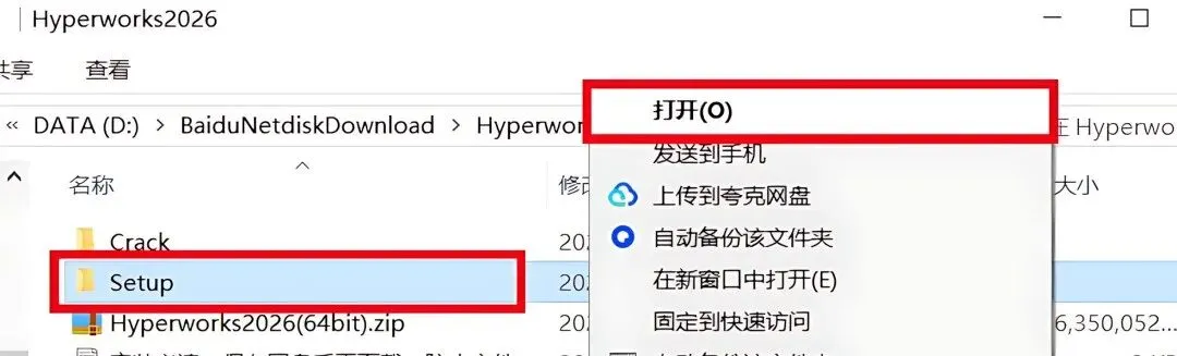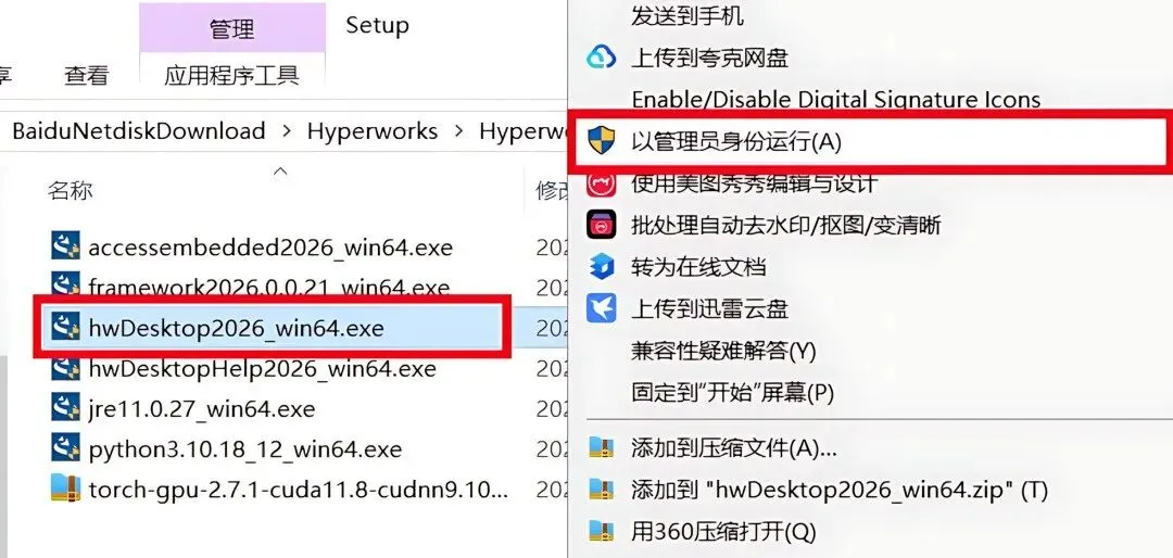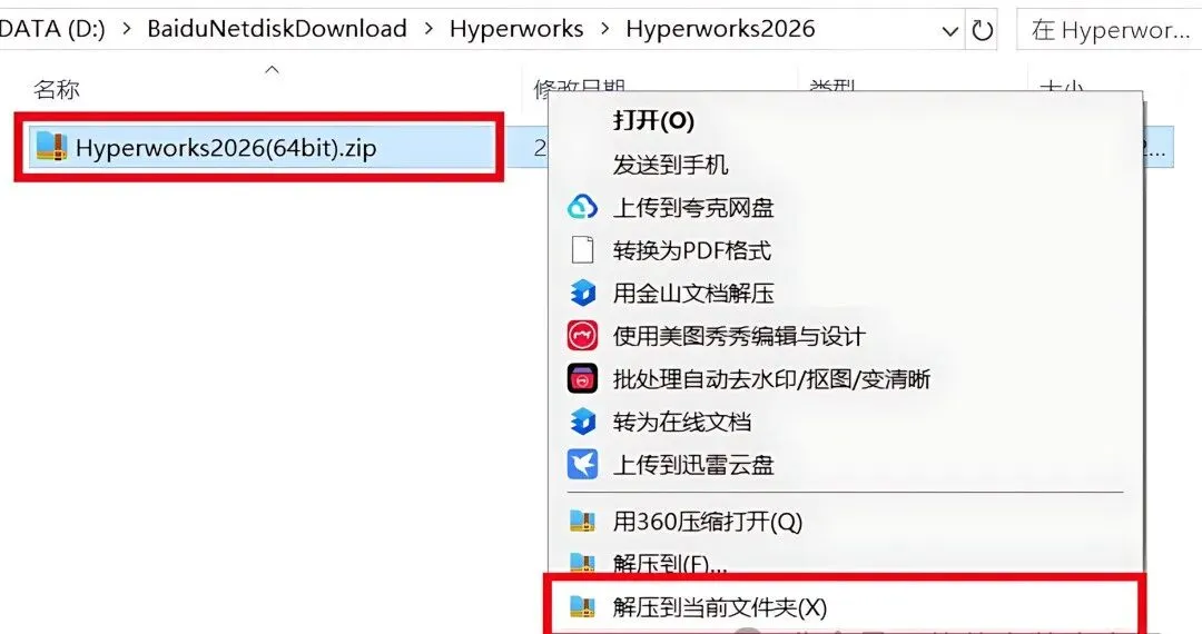 1.下载HyperWorks2026软件安装包到电脑上,右键选择【解压到当前文件夹】。