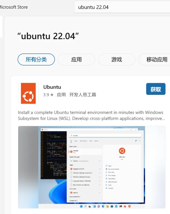 打开微软商店(按Win+S键搜“微软商店”)。搜索“Ubuntu”,选“Ubuntu 22.04 LTS”。