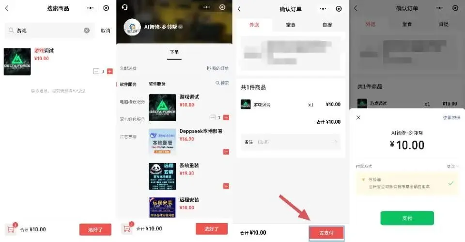 确认支付:核对你的收货地址(远程服务也需要填写方便我们联系)和订单信息,点击「去支付」,支付成功后我们的技术师傅会第一时间联系你~
