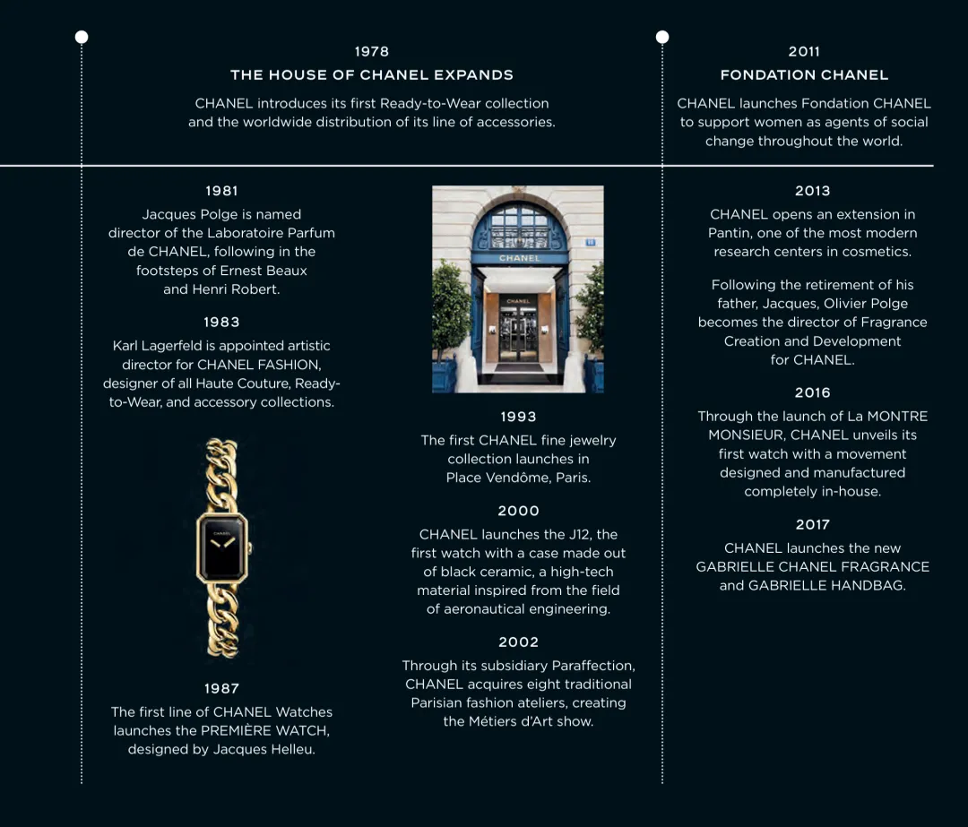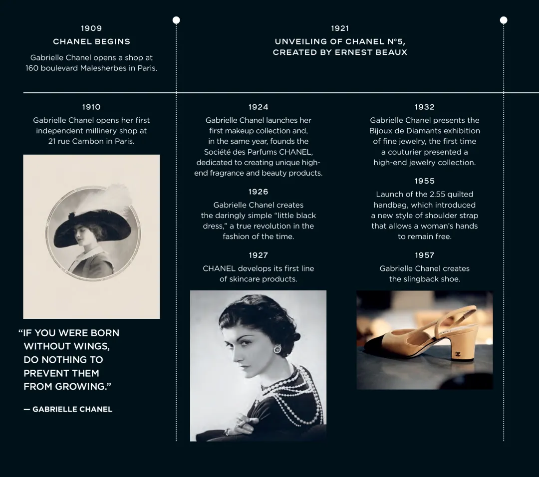 品牌创立:1910年,可可·香奈儿在康朋街21号开设了名为“Chanel Modes”的女帽店,其设计的帽子受到法国女演员的欢迎,为品牌赢得声誉。1913年,她在多维尔开设第一家服装店,推出运动风格服装,革新了女性着装观念,获得巨大成功。1918年,香奈儿在巴黎康朋街31号购买了房产,建立了自己的高级定制时装屋,这里成为了香奈儿品牌的核心地带,奠定了品牌在时尚界的地位。