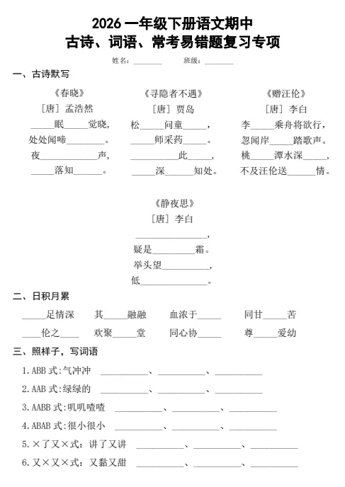 26春 RJ语文一年级《期中复习专项》PDF免费下载
