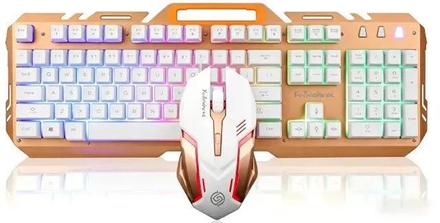 •鼠标:人体工学设计,握感舒适,长时间玩游戏也不会觉得手酸;最高支持3200DPI,可调节灵敏度,玩游戏时,操作精准,没有延迟;土豪金配色,和键盘呼应,整体颜值统一;鼠标带有防滑橡胶涂层,握感更牢固,还配备编织线缆,耐用性更强,不易断裂。