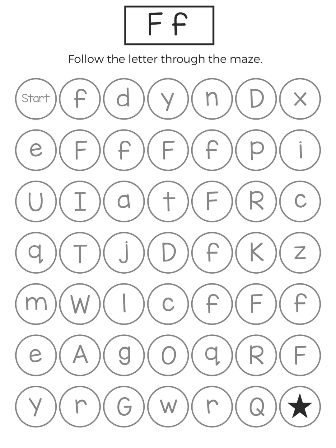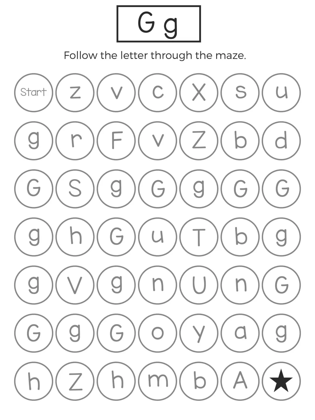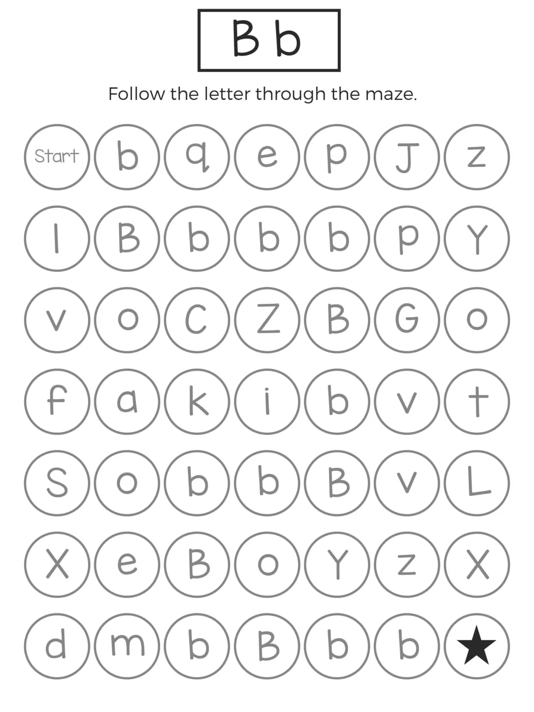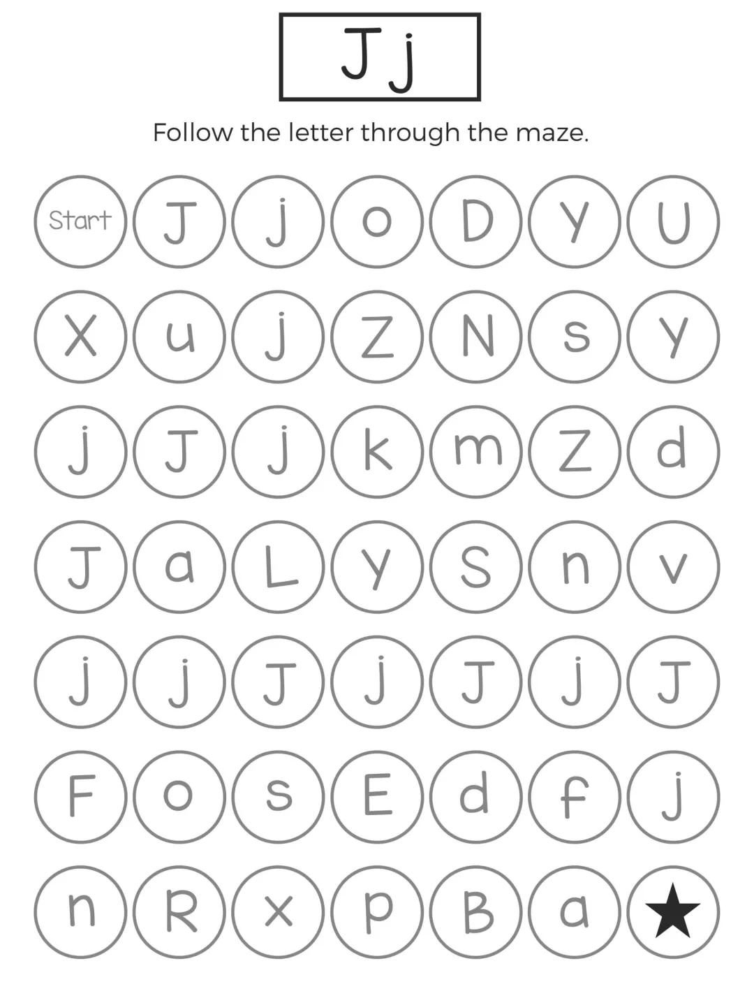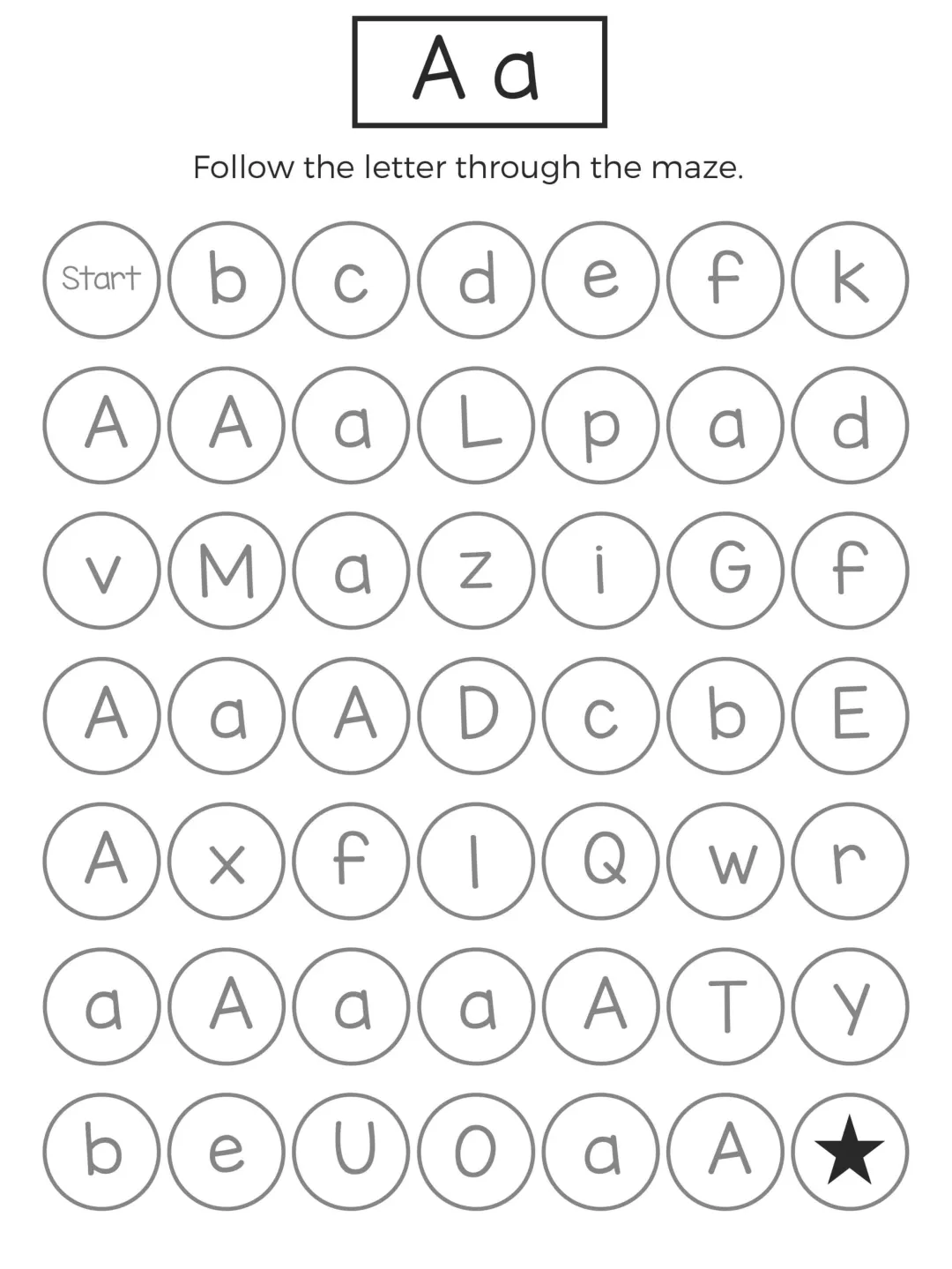 这份字母迷宫练习以闯关形式展开,孩子需要在杂乱字母中追踪目标字母,既能强化字母记忆,又能锻炼手眼协调和耐心,题型简单有趣、操作轻松,不用复杂工具就能练习,非常适合低龄孩子英语启蒙,在趣味游戏中轻松掌握 26 个字母的认读与区分。