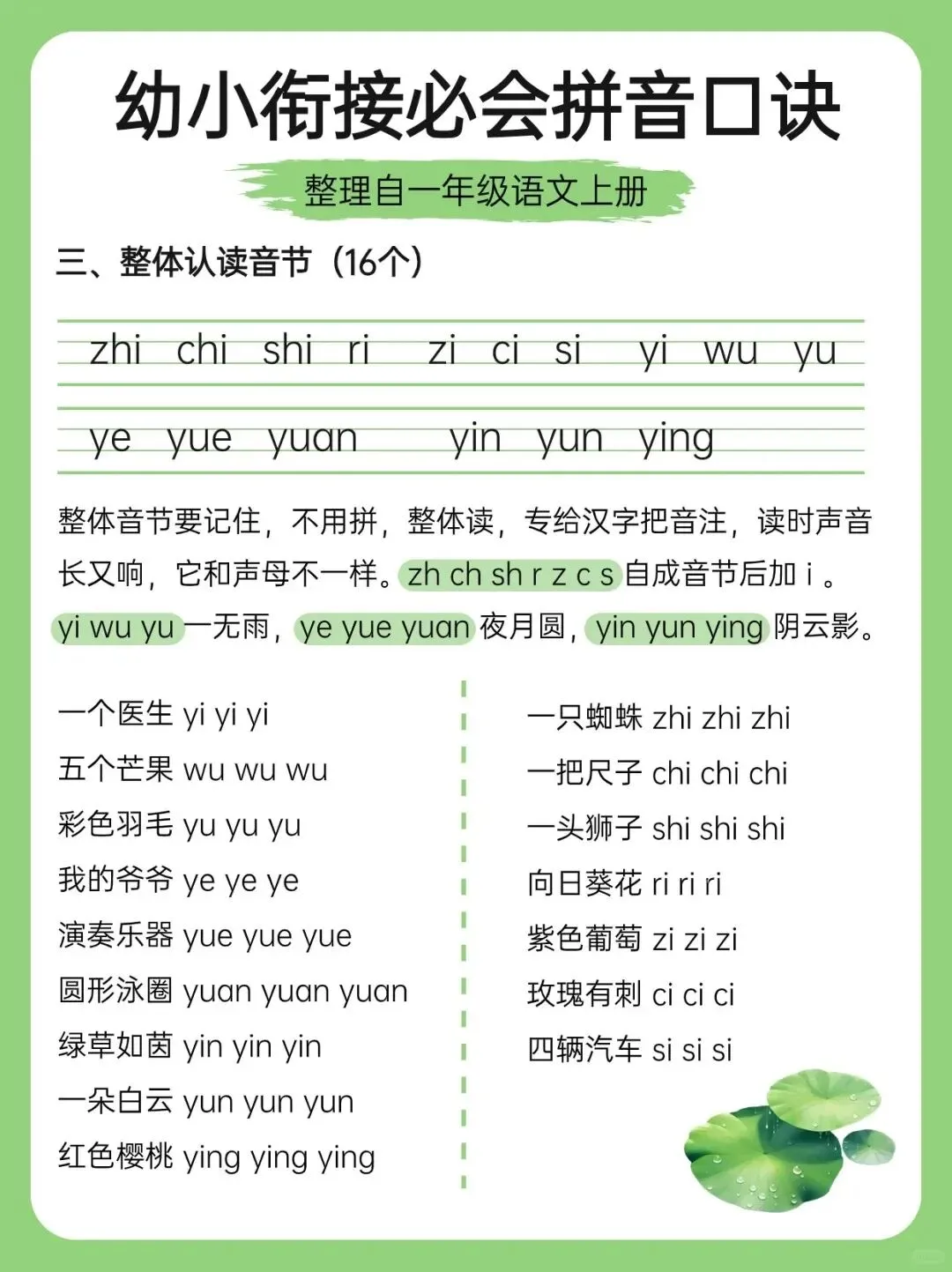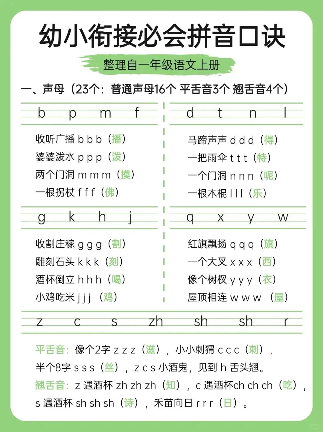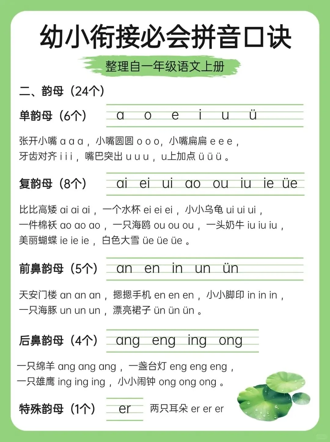 拼音字母表打印版pdf,幼小衔接拼音口诀儿歌大家好,这里是淘学学资料库,这份《幼小衔接必会拼音口诀》,完整 pdf 电子档共 3 页。这份资料把一年级拼音重点整理成朗朗上口的口诀,涵盖单韵母、复韵母、前鼻韵母、后鼻韵母、特殊韵母和 16 个整体认读音节,每类都配好记短句,孩子轻松背会、快速掌握拼音发音规律,特别适合幼小衔接阶段打基础。这份资料用简单好记的顺口溜形式,把复杂拼音知识变得直观易懂,单韵母、复韵母分类清晰,整体认读音节有专属记忆窍门,不用死记硬背,孩子读几遍就能记住,既能快速熟悉拼音发音,又能为小学一年级语文学习做好准备,是学前孩子学拼音的实用好资料。(公众号底部菜单查看完整pdf获取方式)