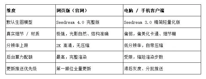 当你感觉到豆包网页版AI图真实度、细节、画质全面优于电脑桌面客户端、手机App端,是字节豆包模型版本、算力配额、分辨率上限、渲染参数、灰度灰度放量这5点底层差异导致的,