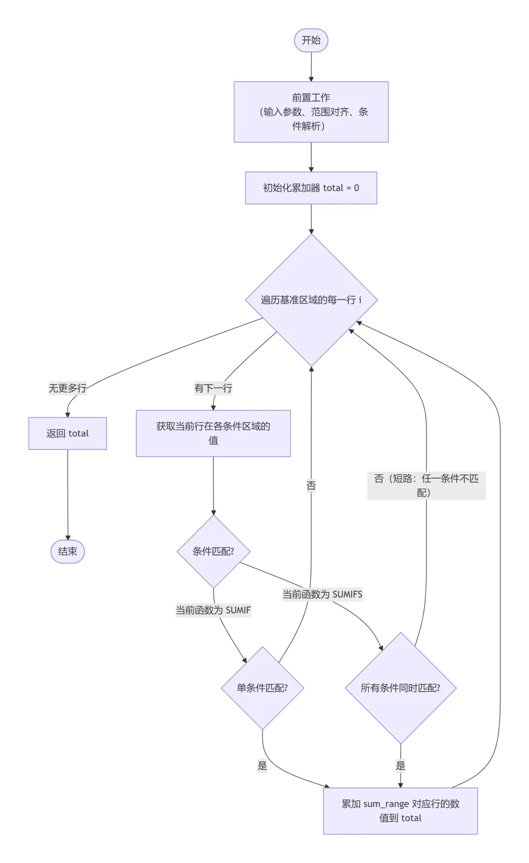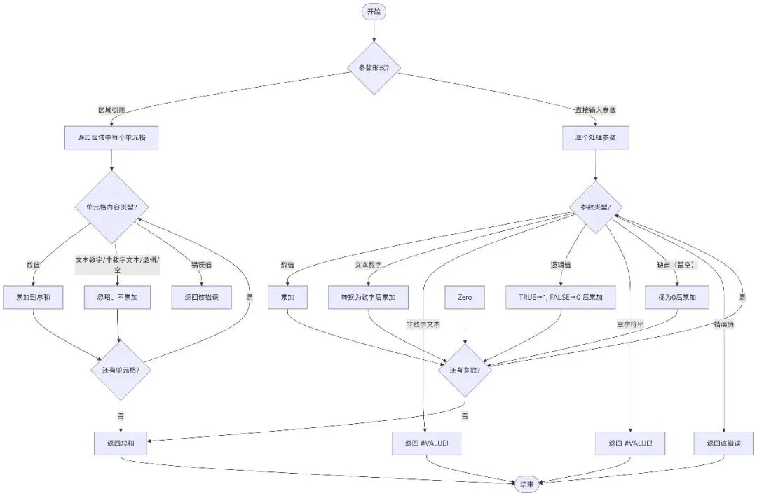 需要注意的是,SUMIF函数和SUMIFS函数的求值机制本质是基于行的条件过滤与聚合——其通过遍历条件区域,对每个单元格应用预设的匹配规则,决定是否累加对应的求和单元格。这种通过牺牲逻辑表达的自由度换取极致的大数据量处理性能的设计虽然保证了其在处理大量数据时的效率(尤其是SUMIFS的多条件一次性扫描),但也限制了其对复杂逻辑(如OR嵌套)的直接支持,迫使用户采用多公式相加或数组公式来实现更灵活的筛选条件。