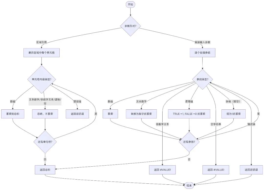 需要注意的是,SUM函数和PRODUCT函数在处理不同数据类型数据时的行为完全一致,没有任何差异,其会自动忽略数据区域中非数值数据的干扰,仅运算数据区域中的数字及文本型数字。但是,当逻辑值直接作为函数参数输入时,函数会将TRUE和FALSE视为1和0参与运算;当文本直接作为函数参数输入时,函数会返回错误值返回值#VALUE!(文本型数字会被自动转换为数字参与运算);当空字符串""作为函数参数输入时,函数会返回错误值返回值#VALUE!。