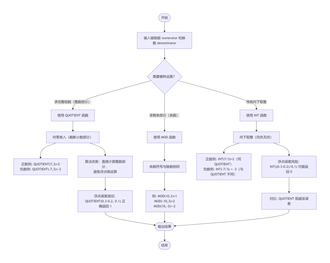 QUOTIENT函数与MOD函数互补,其舍弃余数,仅保留除法运算的整数部分,主要应用于“按容量分组后完整组数”的计算。需要注意的是,QUOTIENT函数始终向零舍入,即截断小数部分,而非向下取整,例如,=QUOTIENT(-7,3)返回-2(因为-7÷3≈-2.33,向零取整得-2),而向下取整则会得到-3。此外,QUOTIENT函数采用专门的计算算法,避免先计算浮点商再取整的传统路径(如INT函数),而是直接确定除法结果的整数部分,这一机制能够显著降低浮点误差对结果的影响。