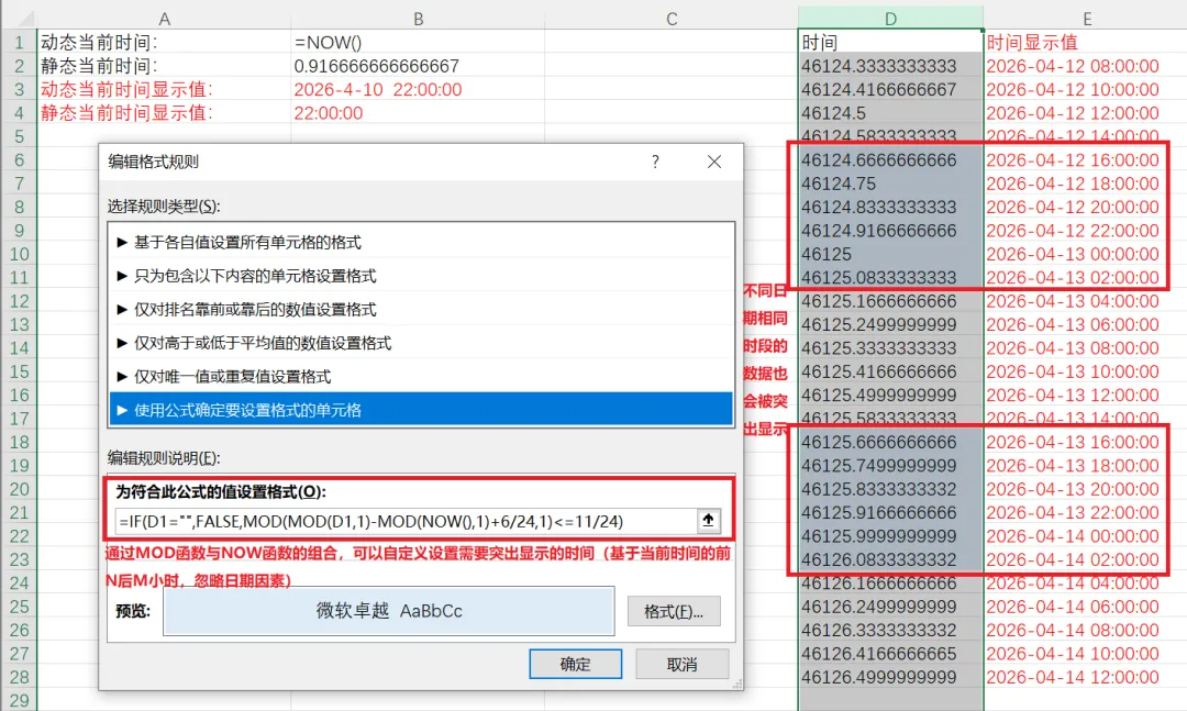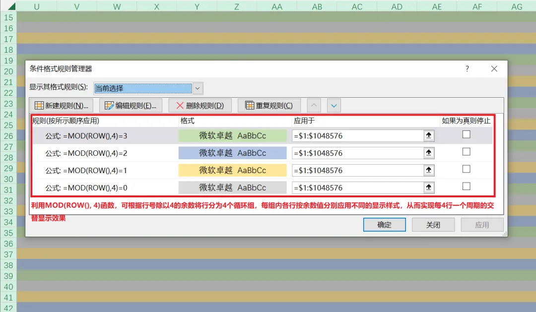 MOD函数的作用是在整数除法中提取“剩余部分”,即取模,其主要应用于判断整除性(对2取模)、构建循环周期(对周期取模)、实现分组索引(将连续编号均匀映射到固定范围)、处理时间或角度换算等离散数学与周期逻辑场景。例如,利用MOD函数结合ROW函数构建周期性判断,能够轻松实现Excel表格的行间交替显示(如隔行填充底色),其不仅是数据美化的常用手段,还能有效增强长表格的可读性,减少视觉疲劳,避免错行阅读,极大提升了表格的灵活性与专业度: