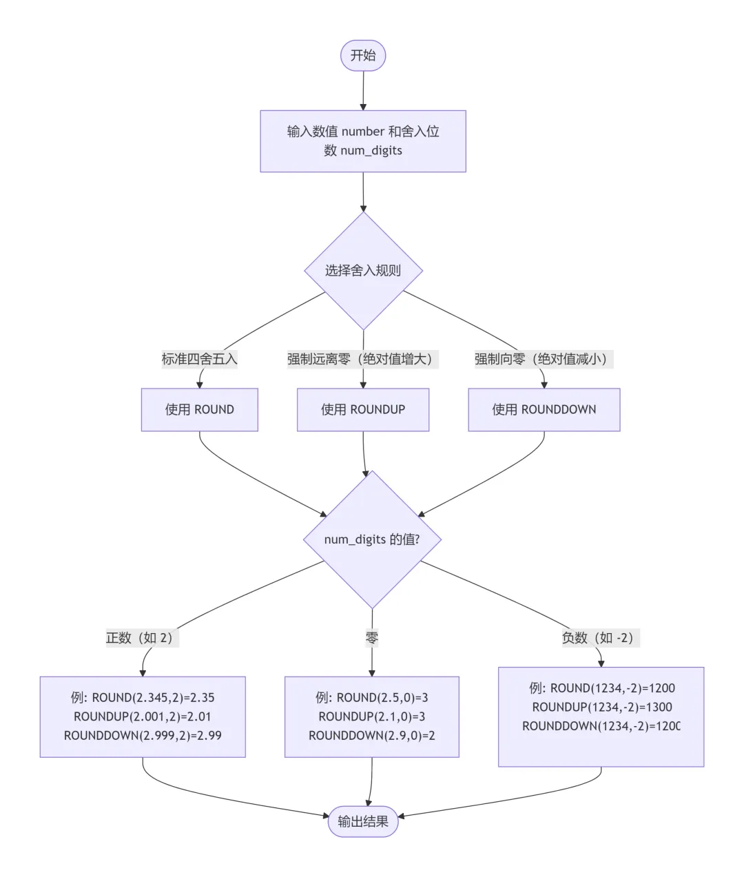 =ROUND(数值number,小数位数num_digits) '将数字四舍五入到指定的位数=ROUNDUP(数值number,小数位数num_digits) '远离零的方向将数字进行向上舍入=ROUNDDOWN(数值number,小数位数num_digits) '朝着零的方向将数字进行向下舍入=INT(数值number) '将数字向下取整为最接近的整数=TRUNC(数值number,[小数位数num_digits]) '通过删除数字的小数部分将数字截断为整数=ODD(数值number) '返回数字向上舍入到的最接近的奇数=EVEN(数值number) '返回数字向上舍入到的最接近的偶数=MROUND(数值number,倍数multiple) '返回一个舍入为所需倍数的数字=FLOOR.MATH(数值number,[基数significance],[模式mode]) '将数字向下舍入为最接近的整数或最接近的指定基数的倍数,Excel 2013及以上版本适用=CEILING.MATH(数值number,[基数significance],[模式mode]) '将数字向上舍入到最接近的整数,或者(可选)舍入到最接近的倍数,Excel 2013及以上版本适用