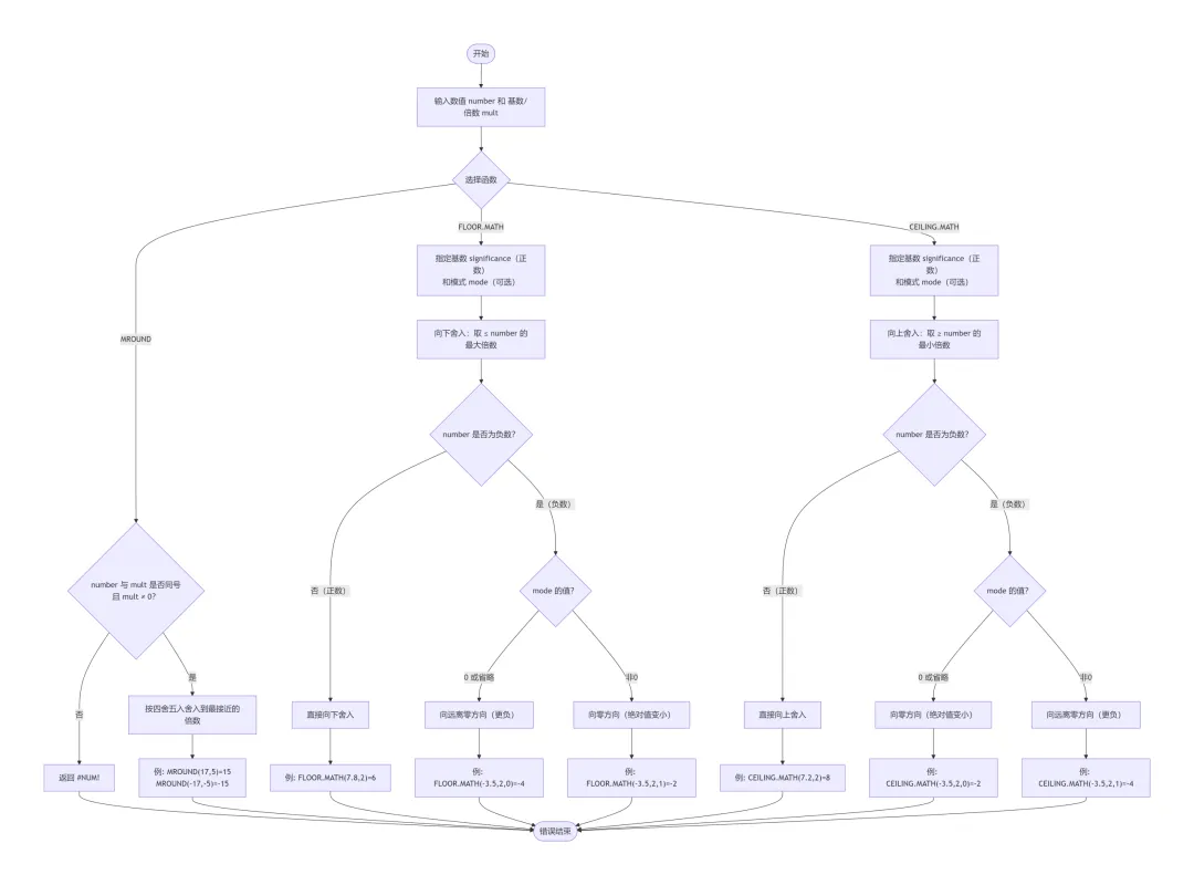 需要注意的是,取整与舍入函数和SUM函数与PRODUCT函数一样,都具备将文本型数字自动转换为数字参与运算的能力;ROUND函数、ROUNDUP函数和ROUNDDOWN函数的第二参数可以为负数,这一特性使得这三个函数不仅适用于小数精度的控制,还能灵活处理整数的数量级舍入,是其他取整与舍入函数所不具备的独特优势,例如=ROUND(1234,-2)返回1200;INT函数与TRUNC函数在处理正数时结果相同,但在处理负数时行为相反,前者向下取整后者向上取整;MROUND函数要求数值与倍数同号,且倍数非零,否则其返回错误值#NUM!。