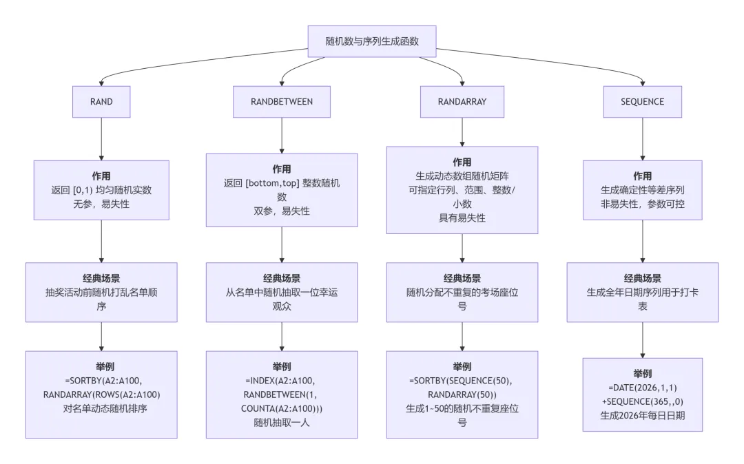随机与序列函数的主要作用是生成动态或静态的数字集合,包括随机小数、随机整数以及有规律的等差序列,其常用于数据模拟(如蒙特卡洛模拟、抽样测试)、随机分组或排序、批量生成序号或日期序列,以及创建动态数组公式所需的连续编号。
