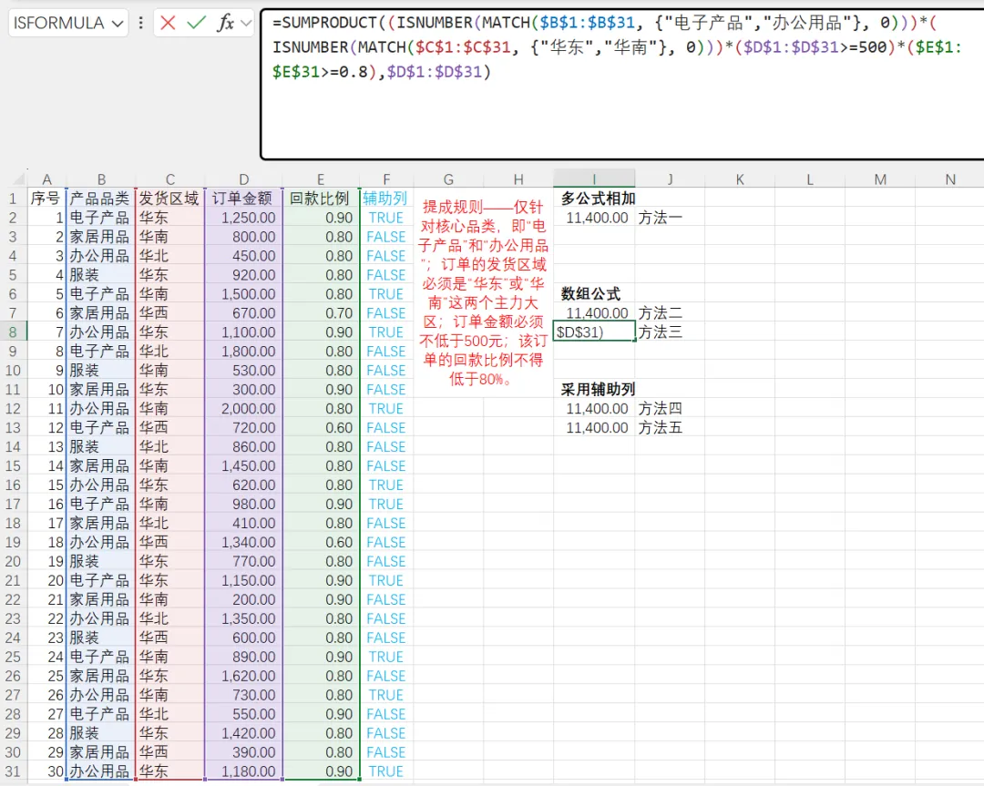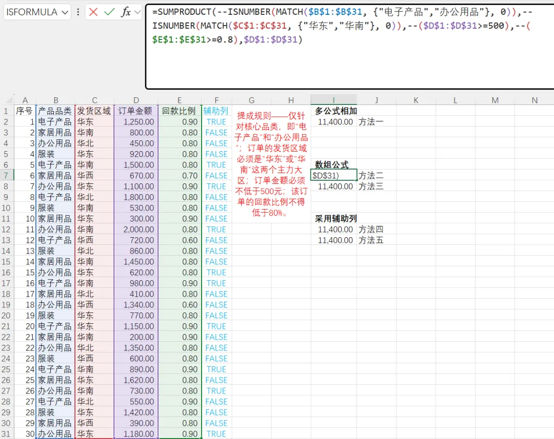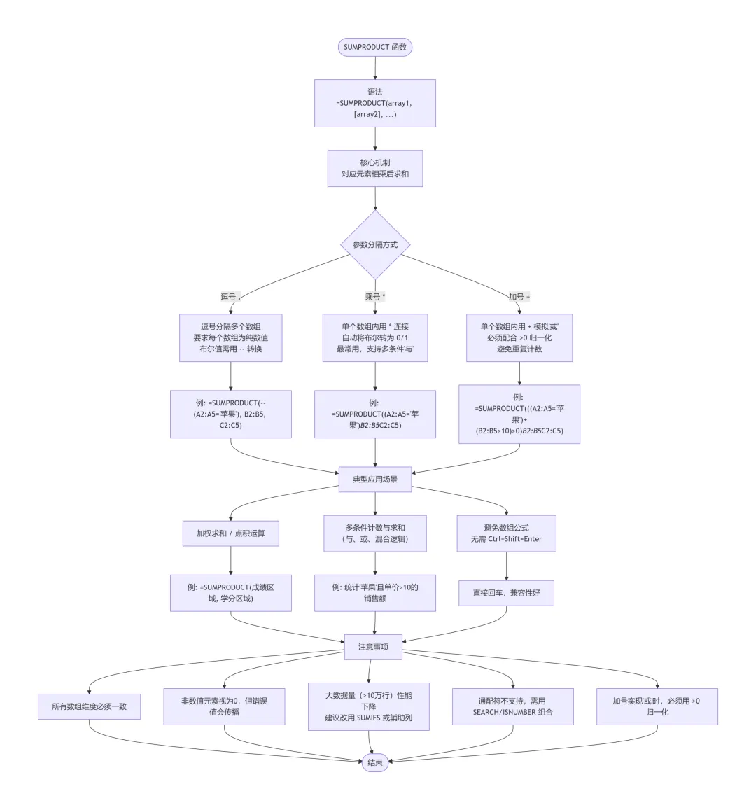 =SUMPRODUCT(数组1array1,[数组2array2],[数组3array3],...) '逗号,是标准参数分隔符,用于传入多个独立的数组参数=SUMPRODUCT((条件1criteria1)*(条件2criteria2)*求和范围sum_range) '乘号*用于在单个数组参数内部进行元素级乘法,模拟逻辑“与(AND)”=SUMPRODUCT(((条件1criteria1)+(条件2criteria2)+...>0)*求和范围sum_range) '加号+用于在单个数组参数内部进行元素级加法,模拟逻辑“或(OR)”,由于某行数据可能同时满足多个条件,为了避免重复计数需要通过>0将其归一化为1=SUMPRODUCT(((条件1criteria1)+(条件2criteria2)+...>0)*(条件AcriteriaA)*求和范围sum_range) '乘号*与加号+混合使用可以实现复杂的(A OR B) AND C逻辑