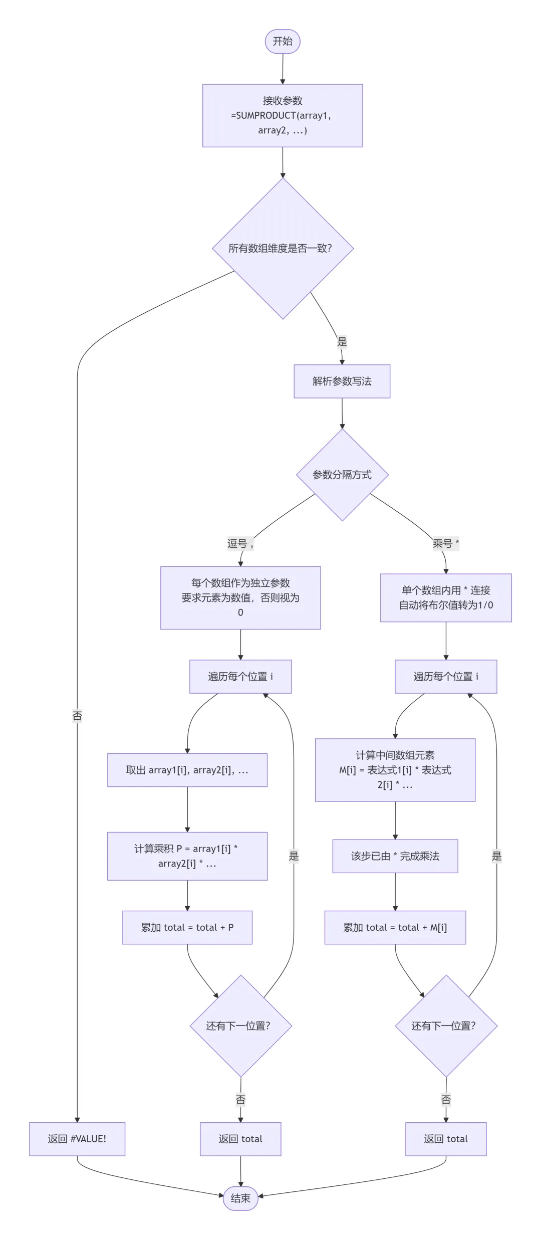 SUMPRODUCT函数的求值机制是将用户提供的多个数组参数(或通过乘号连接生成的单个数组)中对应位置的元素相乘,然后将所有乘积相加得到一个总和。其底层采用向量化的逐元素运算,在内存中构建与原始数据区域等大的临时数组,并自动将布尔值TRUE/FALSE转换为1/0参与乘法,最后通过内部循环累加。这种机制的主要优点在于逻辑表达非常灵活,能够通过乘号模拟“与”条件、加号模拟“或”条件,并支持任意复杂的嵌套组合,同时它作为普通函数无需按Ctrl+Shift+Enter即可完成数组运算,书写方便且兼容性好,还天然适用于加权求和、点积等线性代数场景。然而,该机制也存在明显缺点:由于需要构建完整的中间数组且不具备短路优化(即使某行条件不满足也会计算全部表达式),在处理超过十万行的大数据量时性能显著下降,内存占用较高,容易导致Excel响应变慢;同时它对错误值极为敏感,参与运算的任何单元格包含错误值都会使整个函数返回错误,且无法像SUMIFS那样通过条件过滤跳过错误行;此外,所有数组参数的维度必须严格一致,否则返回#VALUE!错误,也不支持通配符模糊匹配,需要嵌套其他函数才能实现。因此,SUMPRODUCT更适合中等数据量(五万行以内)且条件逻辑复杂的场景,而对于大数据量且仅需简单“与”条件求和的情形,应优先考虑SUMIFS以获得更高效率。