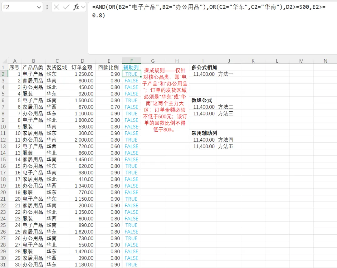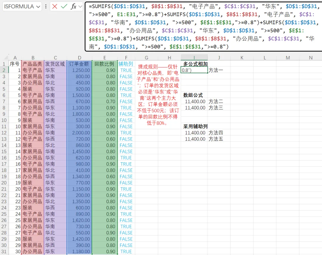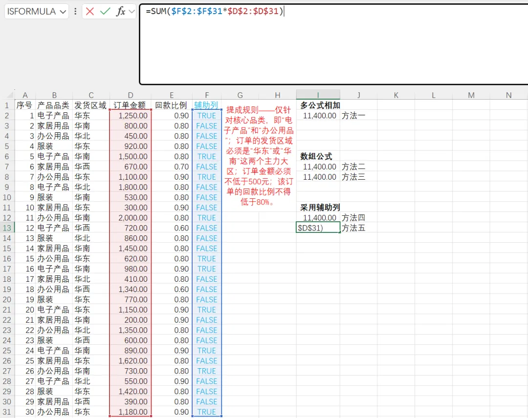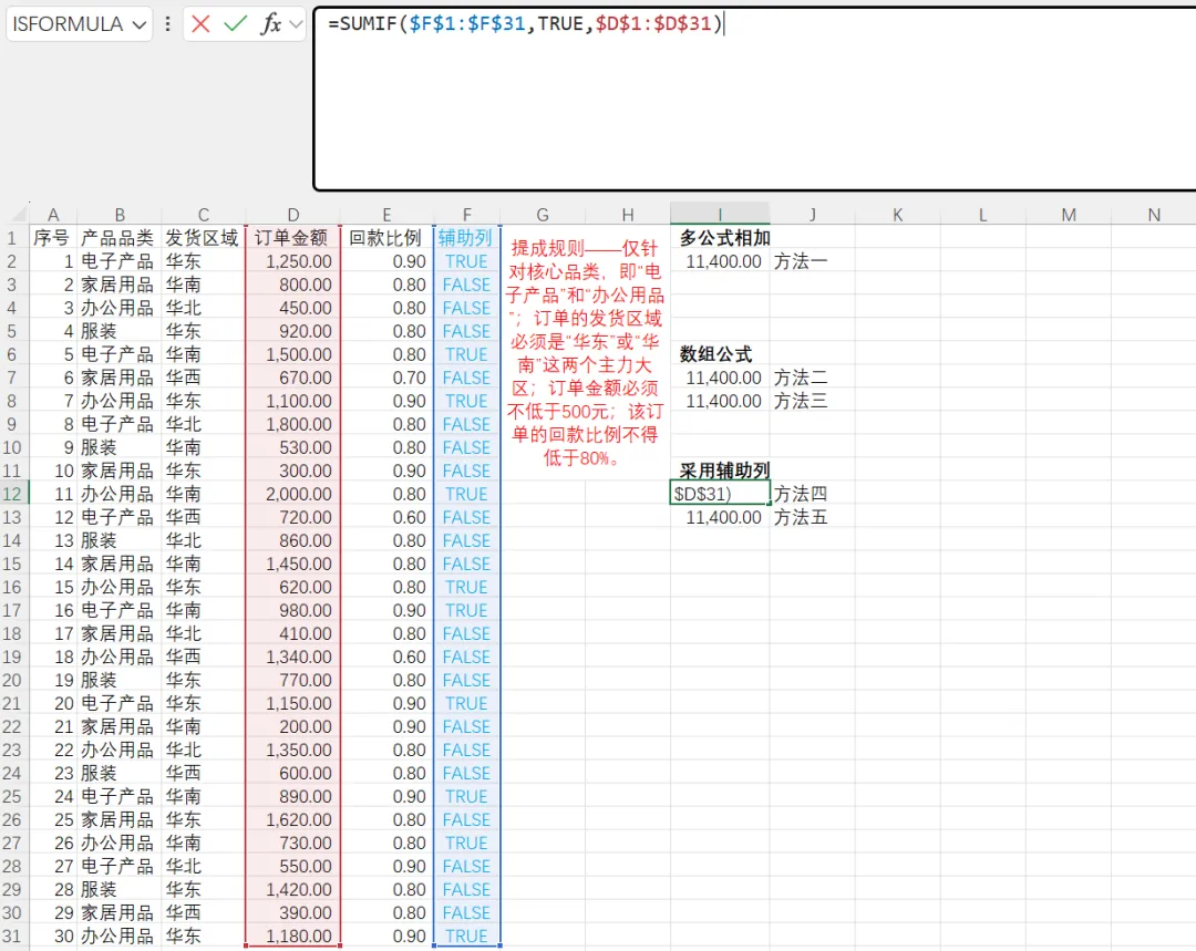 辅助列方案是在原始数据右侧新增一列,用逻辑公式判断每一行是否满足所有条件(返回TRUE或FALSE),然后对辅助列与求和列进行条件求和。这种方法的优点是性能极高——辅助列只计算一次,后续SUMIF函数是聚合函数,即使百万行数据也能快速完成;辅助列中的判断逻辑一目了然,便于分步调试和核对,且业务规则变化时只需修改辅助列公式,无需重写复杂的多条件汇总公式;此外,辅助列可以进一步配合数据透视表或其他分析工具,灵活性很强。其缺点是需要占用额外列,可能破坏原始数据表的整洁性;如果数据源频繁增删行,需要确保辅助列公式正确填充,稍显繁琐。但在绝大多数实际业务中,辅助列是处理超大数据量、复杂逻辑的最稳健方案。