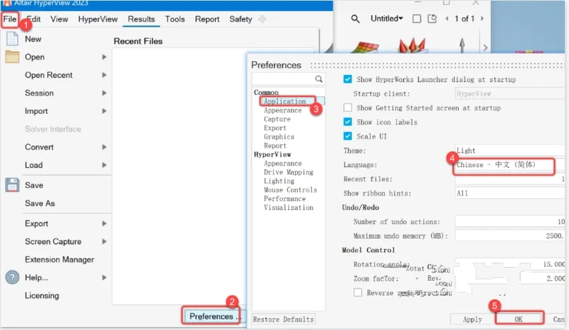 中文设置方法:① 点击【File】菜单,② 选择【Preferences】,③ 点击【application】选项,④ 选择【简体中文】,⑤ 点击【OK】确认,重启软件后即可生效。