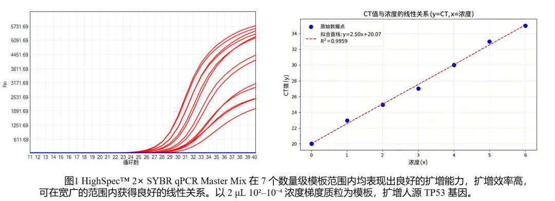 低丰度模板检测是qPCR实验中的常见难点,而HighSpec™ 2× SYBR qPCR Master Mix凭借优异的灵敏度,可稳定检测7个数量级范围的模板量,具备精准、可靠的定量能力,为低模板检测、梯度验证及常规定量分析提供坚实的数据支撑。