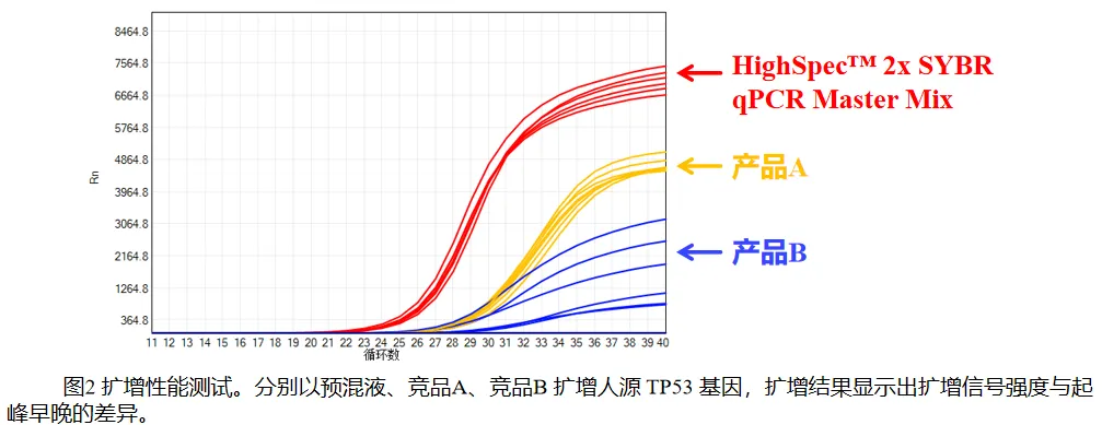 在扩增效率方面,该产品同样表现突出。与同类荧光定量试剂相比,HighSpec™ 2× SYBR qPCR Master Mix起峰时间更早、荧光信号强度更高,实现了专一性与扩增效率的双重提升,能够快速完成信号放大,大幅缩短实验周期,适配方法开发、常规检测等多样化场景。
