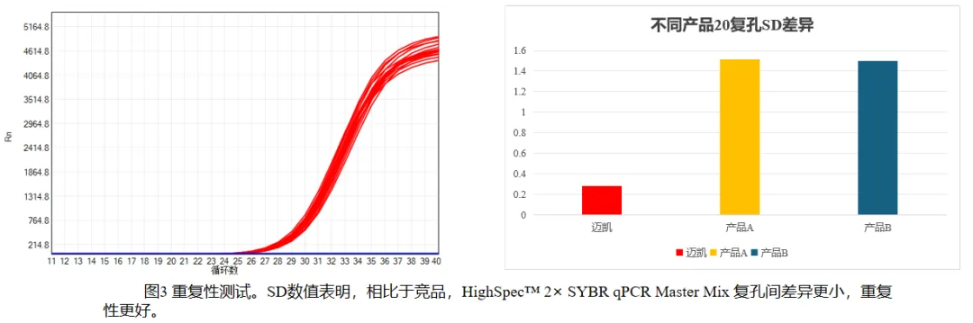 对于批量qPCR实验,结果的重复性是数据可靠性的关键。HighSpec™ 2× SYBR qPCR Master Mix能够在多次重复检测中保持结果的一致性,其SD值更低、孔间差异更小,有效减少实验波动带来的干扰,降低重复实验的工作量。