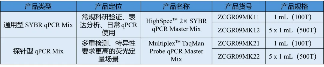 迈凯深知不同实验场景的差异化需求,除HighSpec™ 2× SYBR qPCR Master Mix外,同步提供通用型SYBR qPCR Mix与探针型qPCR Mix两类产品,全面覆盖科研验证、方法开发、临床前研发等不同荧光定量应用场景,为用户提供一站式qPCR产品解决方案,满足不同实验的个性化需求。