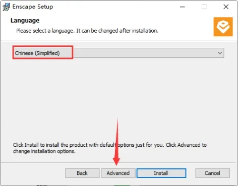 5. 下拉语言选择为【Chinese (Simplified)】(注意:一定要操作,否则安装成功后不是中文版),然后点击【Advanced】。