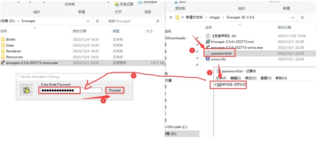 13. 打开安装包中的【password.txt】文本,将注册机密钥:`cgpersia-zmco` 复制到注册机中,然后点击【Proceed】。