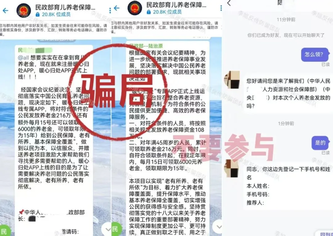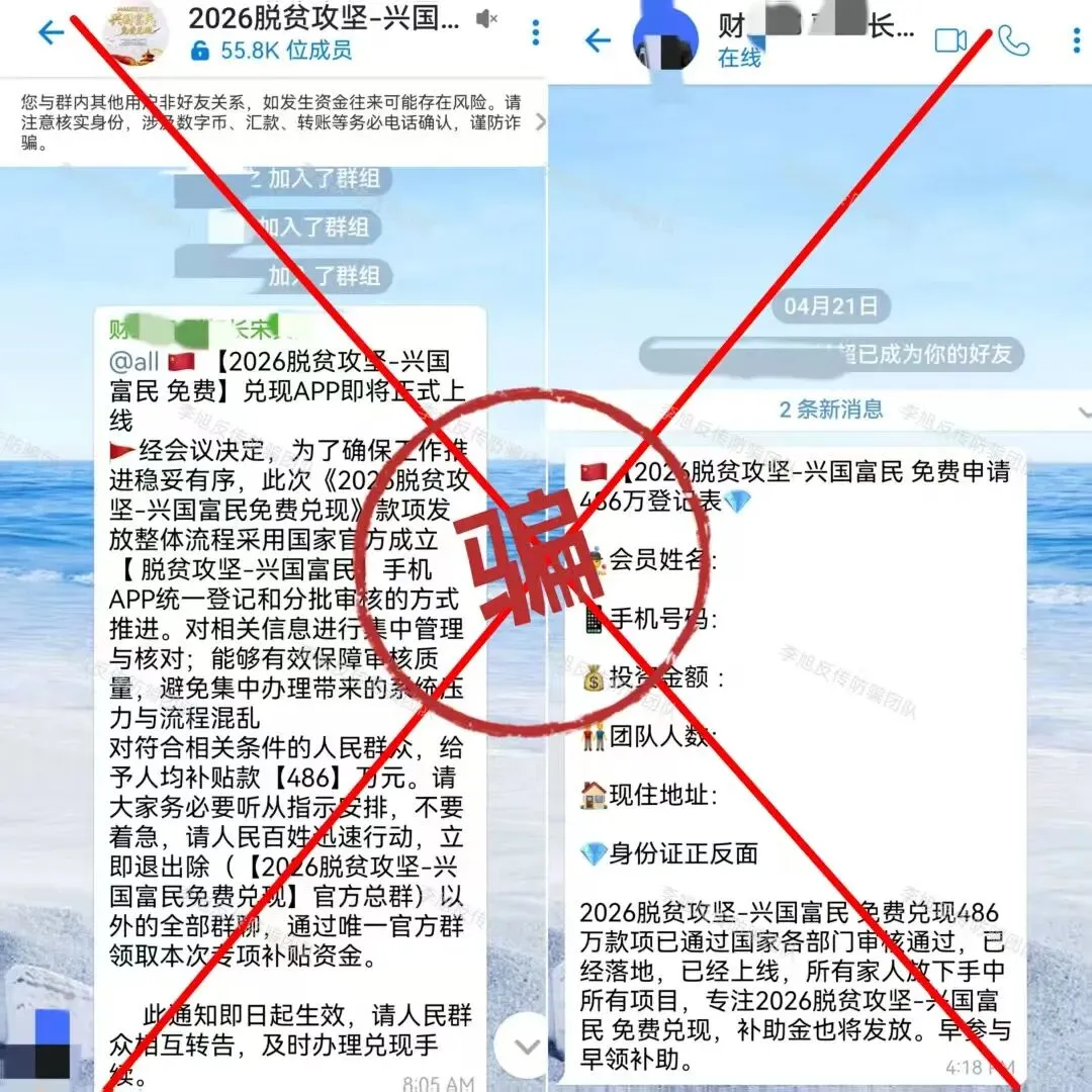 冒充公职人员,在境外聊天软件内组建群组,甚至伪造政策文件,以“免费领取486万民生补贴”为名,诱使大家提交个人信息和身份证照片。