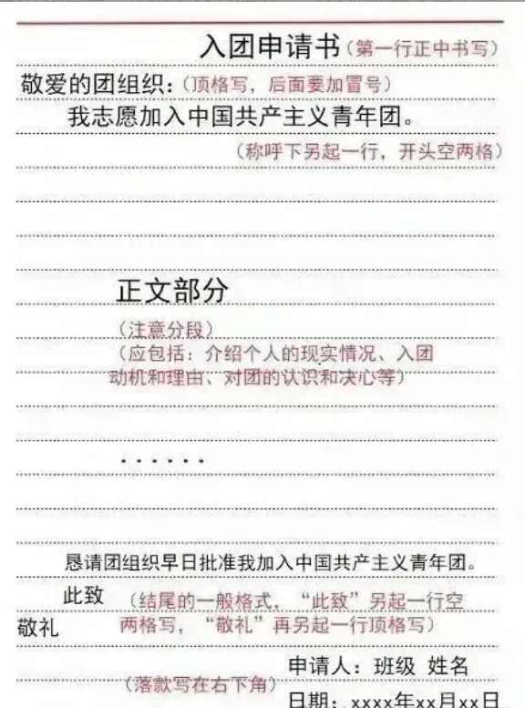 入团申请书的写作格式一般来讲都是固定的,它的内容主要包括五个部分:标题、称呼、正文、结尾、落款。字数要求不少于800字。
