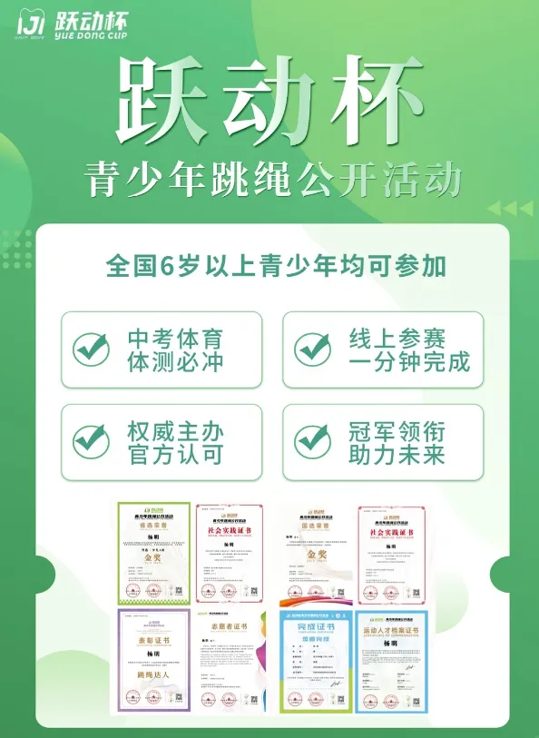 ✅ 零门槛好参与|性价比超高不限基础、6 岁以上就能报只需 线上提交 1 分钟跳绳视频轻松完赛、稳妥拿证、锻炼 + 荣誉双丰收!