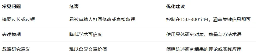 摘要面向的是“潜在引用者”而非“圈内读者”。专业术语可以使用,但要简洁说明,避免造成阅读障碍。