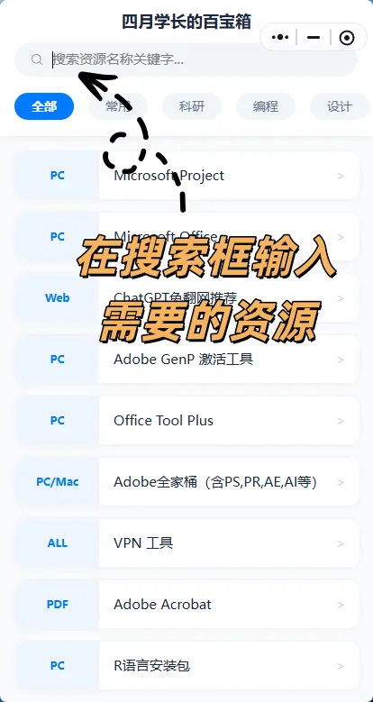 打开【四月学长的百宝箱】小程序,在搜索框输入【Python第三方库】。选择对应的选项,点击复制链接,即可获得对应资源啦。
