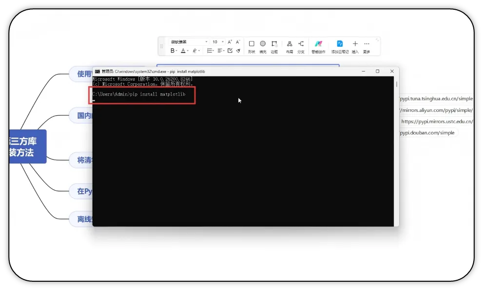 2)输入pip install matplotlib(库的名称,这里以matplotlib为例),按回车键开始安装。