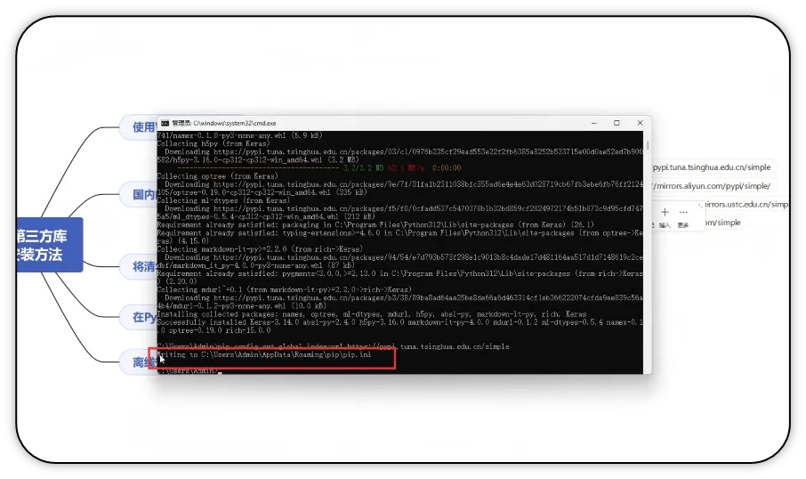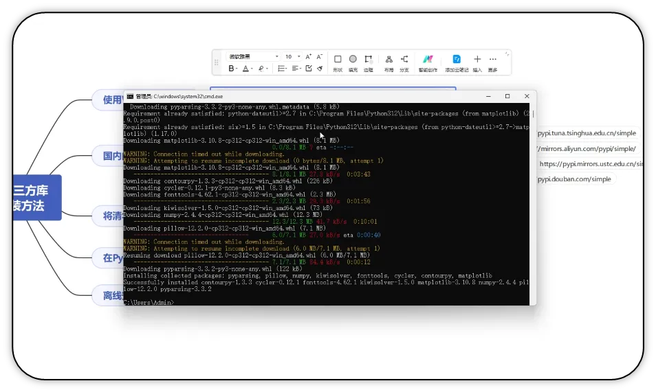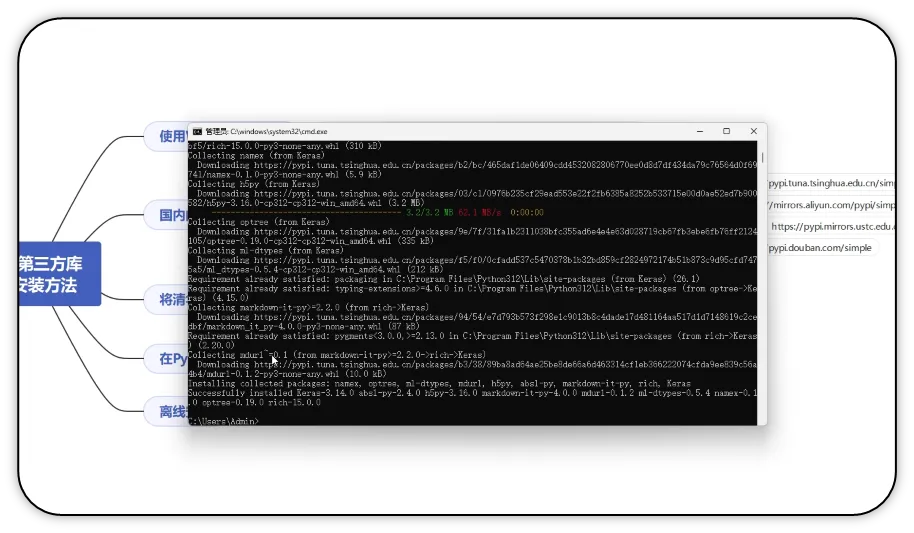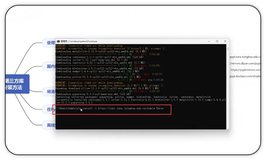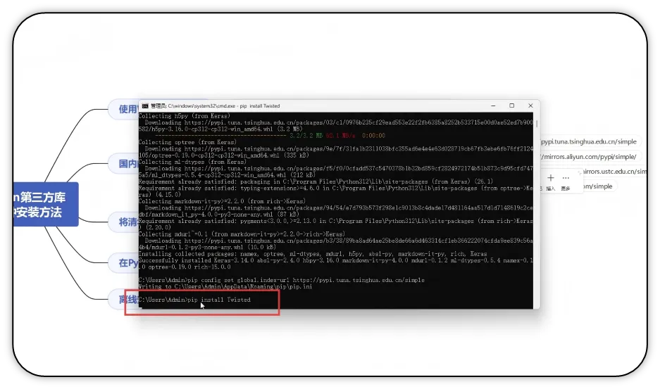 与Python标准库(随Python解释器自带,无需额外安装)不同,第三方库需要通过包管理工具(如pip、conda等)手动安装后才能使用。