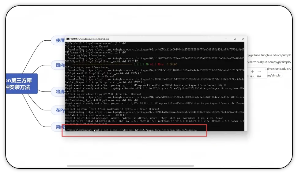 1)以清华镜像源为例,输入pip install -i https://pypi.tuna.tsinghua.edu.cn/simple Keras(库的名称),按回车键。
