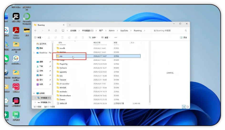 4)打开pip文件夹,查看里面的 pip 配置文件。