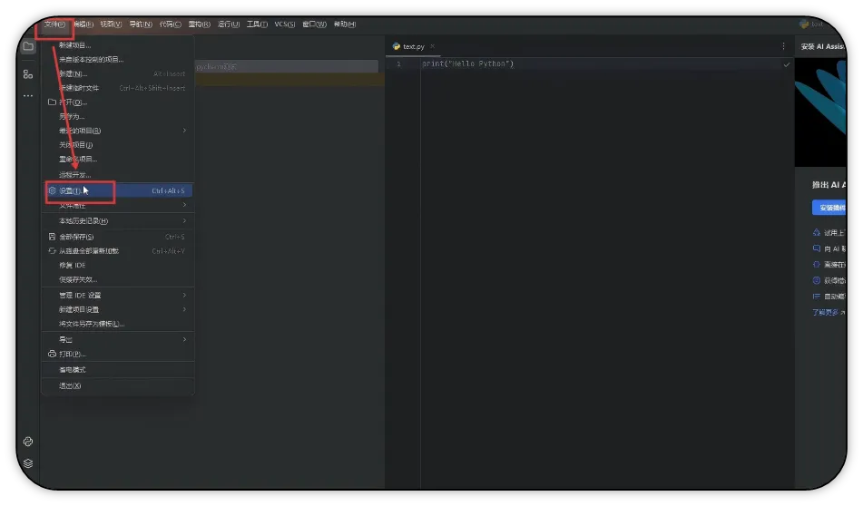 1)打开PyCharm,点击左上角的【文件】,选择【设置】。