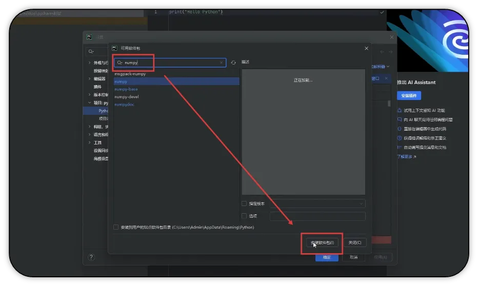 3)在搜索框中输入要安装的库名(以numpy库为例),点击【安装软件包】。