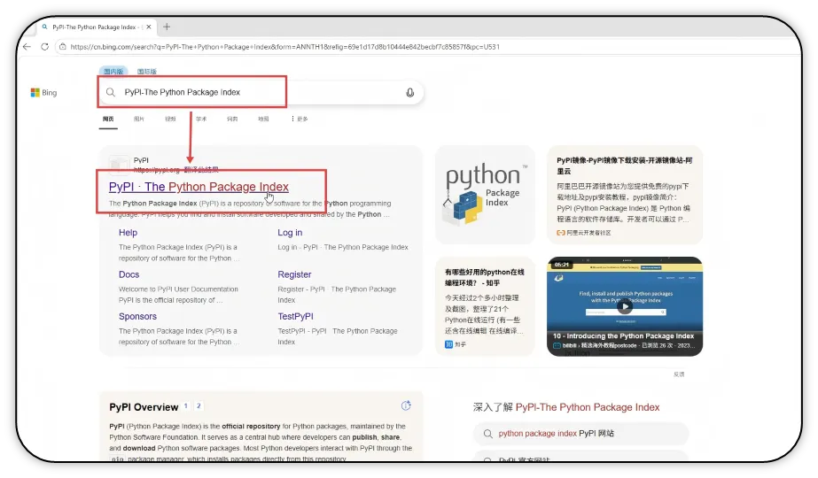 1)在浏览器中搜索PyPl-The Python Package Index(索引包网站),打开官网。