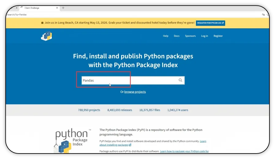 2)在网站搜索框中输入需要安装的库名(Pandas库为例),进行搜索。