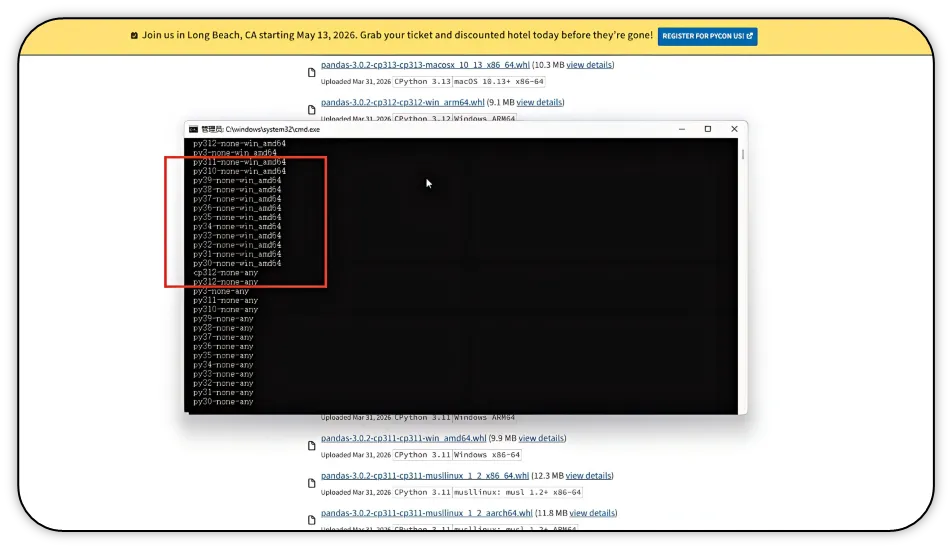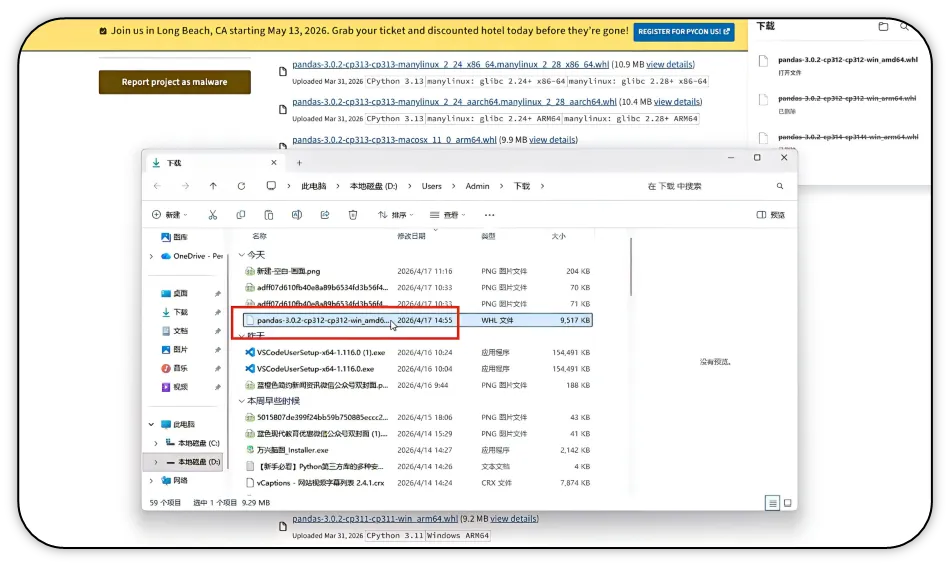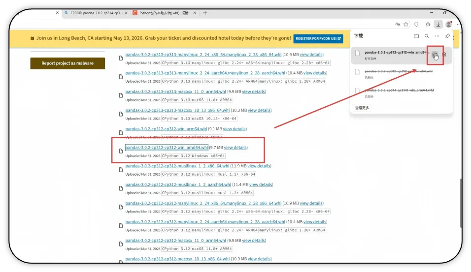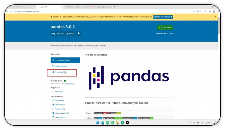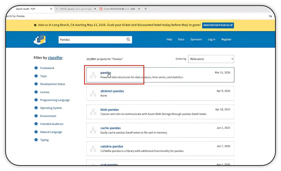 3)在搜索结果中选择对应的 Pandas 库,点击进入详情页。