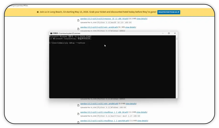 6)输入pip debug –verbose,按回车键。