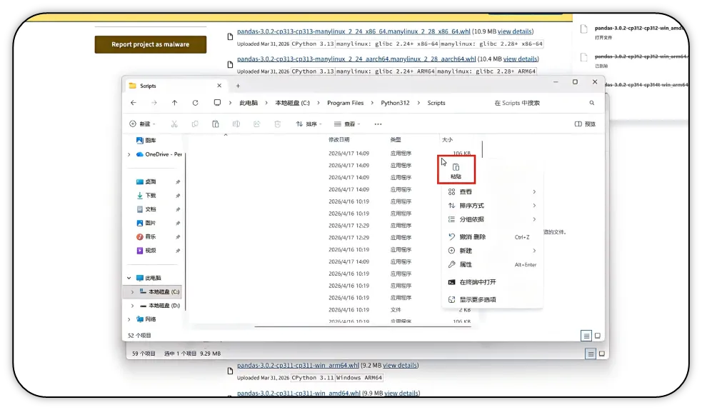 11)在空白处右键,选择【粘贴】,将安装包放入 scripts 目录。