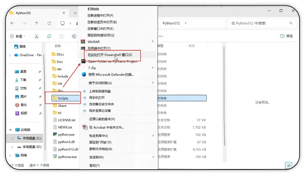 13)回到上一个文件夹,按住shift+鼠标右键点击scripts文件,选择打开【powershell窗口】。