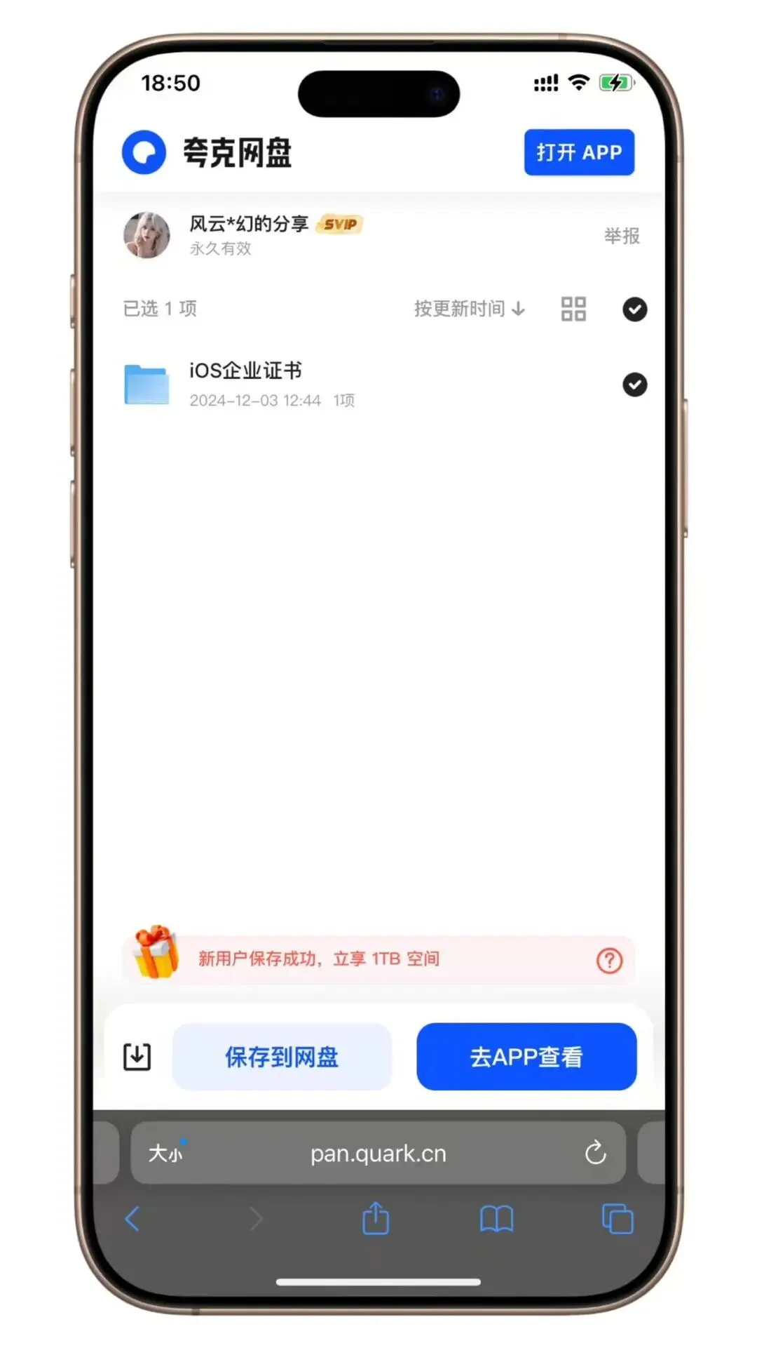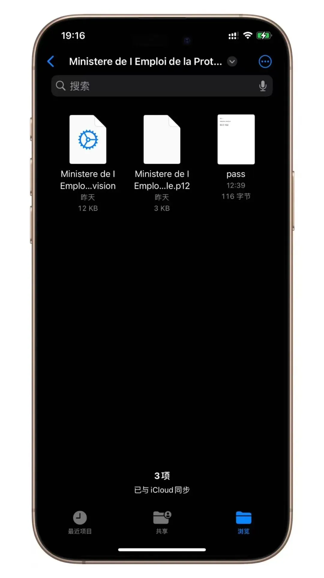 接下来先下载签名证书,小编已经备好,文章底部有获取方法,如上图所示先将证书下载到自己手机,保存到本地文件,然后解压出三个文件:2个文件和一个密码说明
