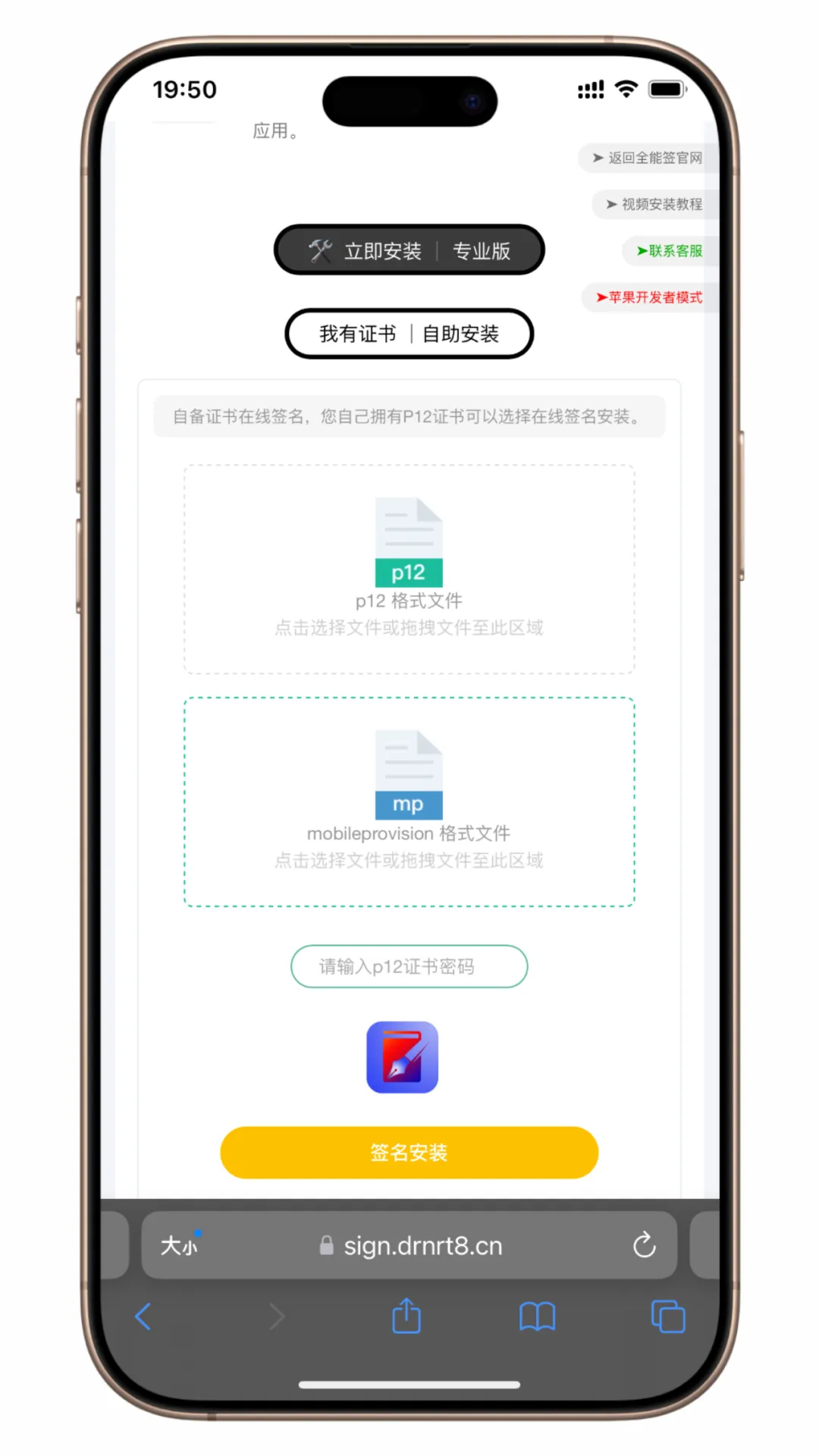如上图所示,点击我有证书自助安装,将解压的2个文件导入全能签文件栏,注意文件后缀不同,不要搞错了,然后填入密码,点击签名安装