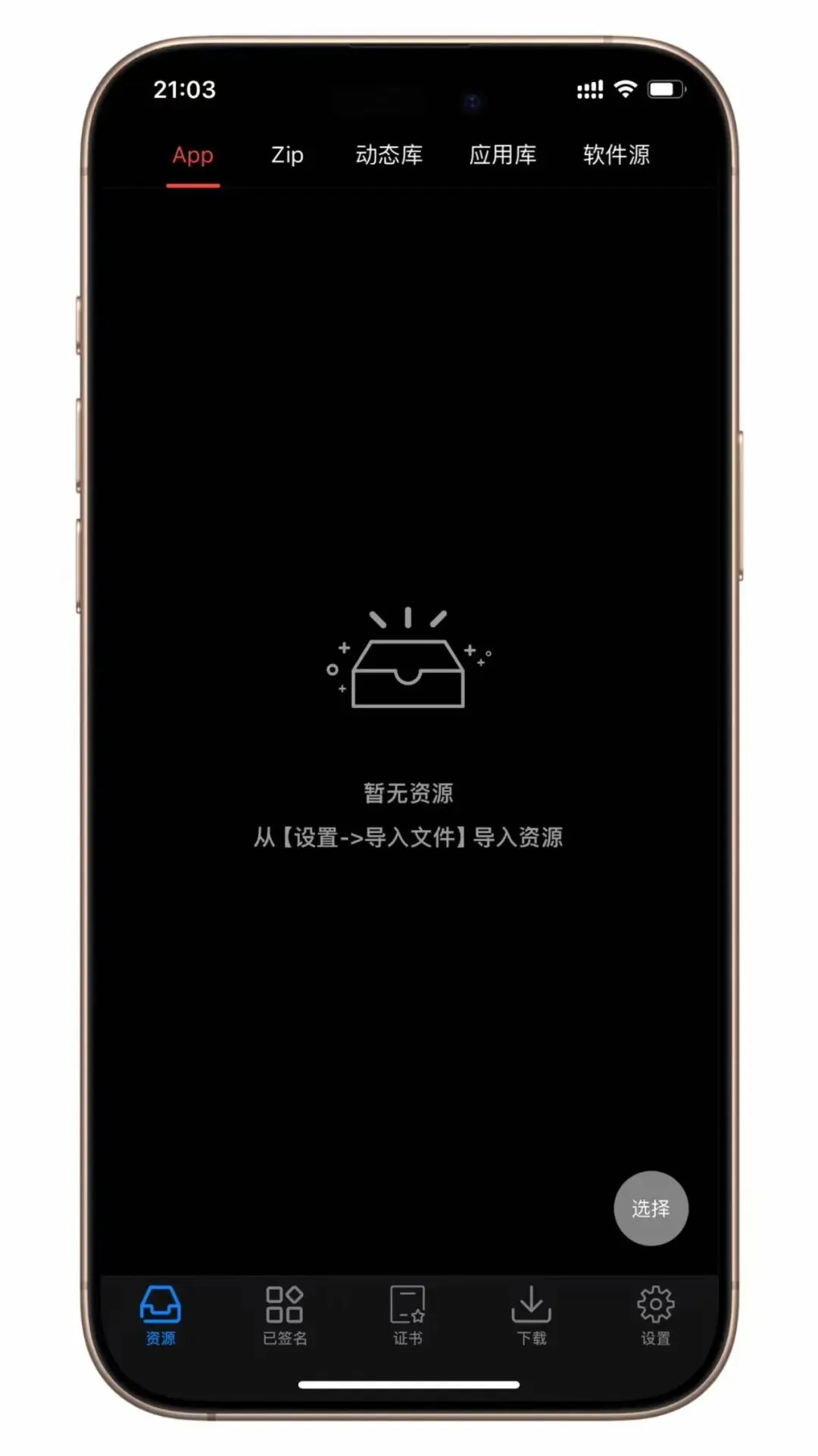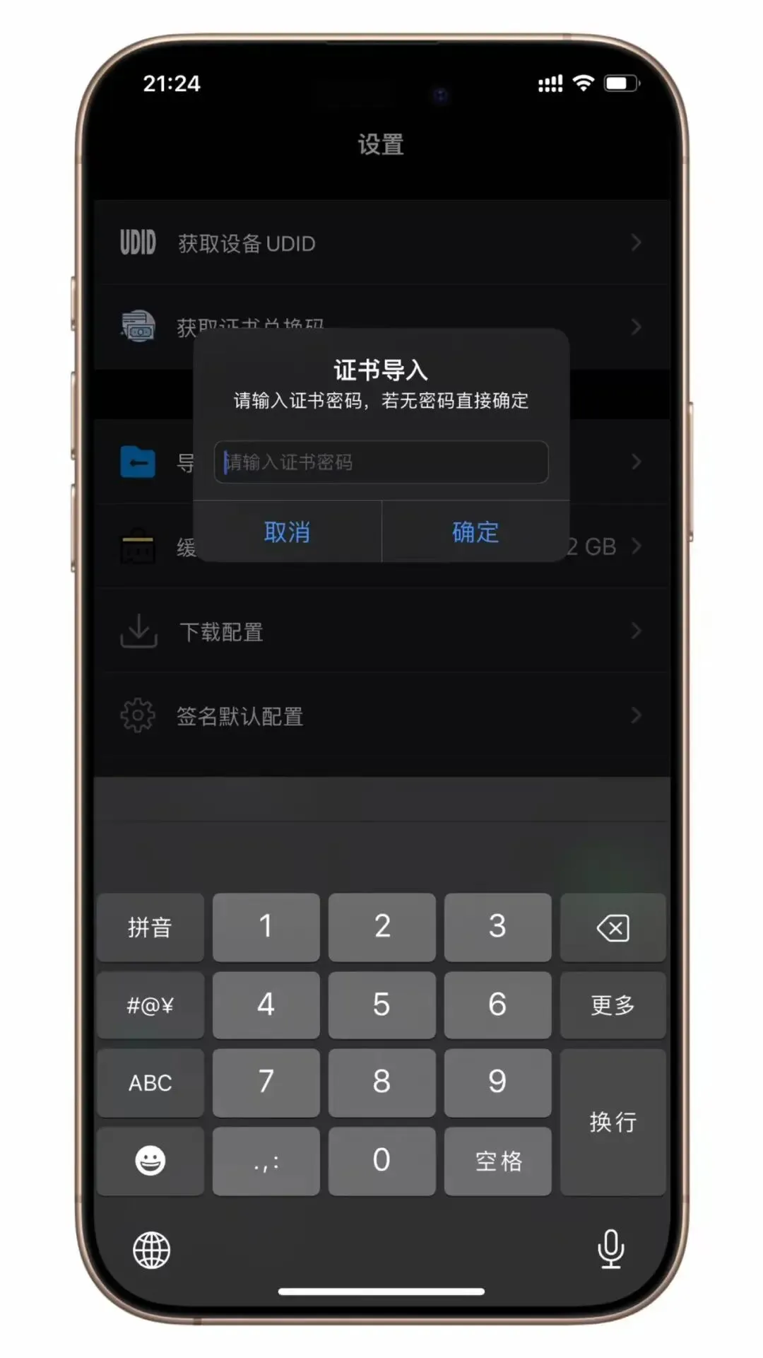 打开全能签点击底部右侧设置-导入文件,输入密码将刚才的证书再次导入一次,如下图所示