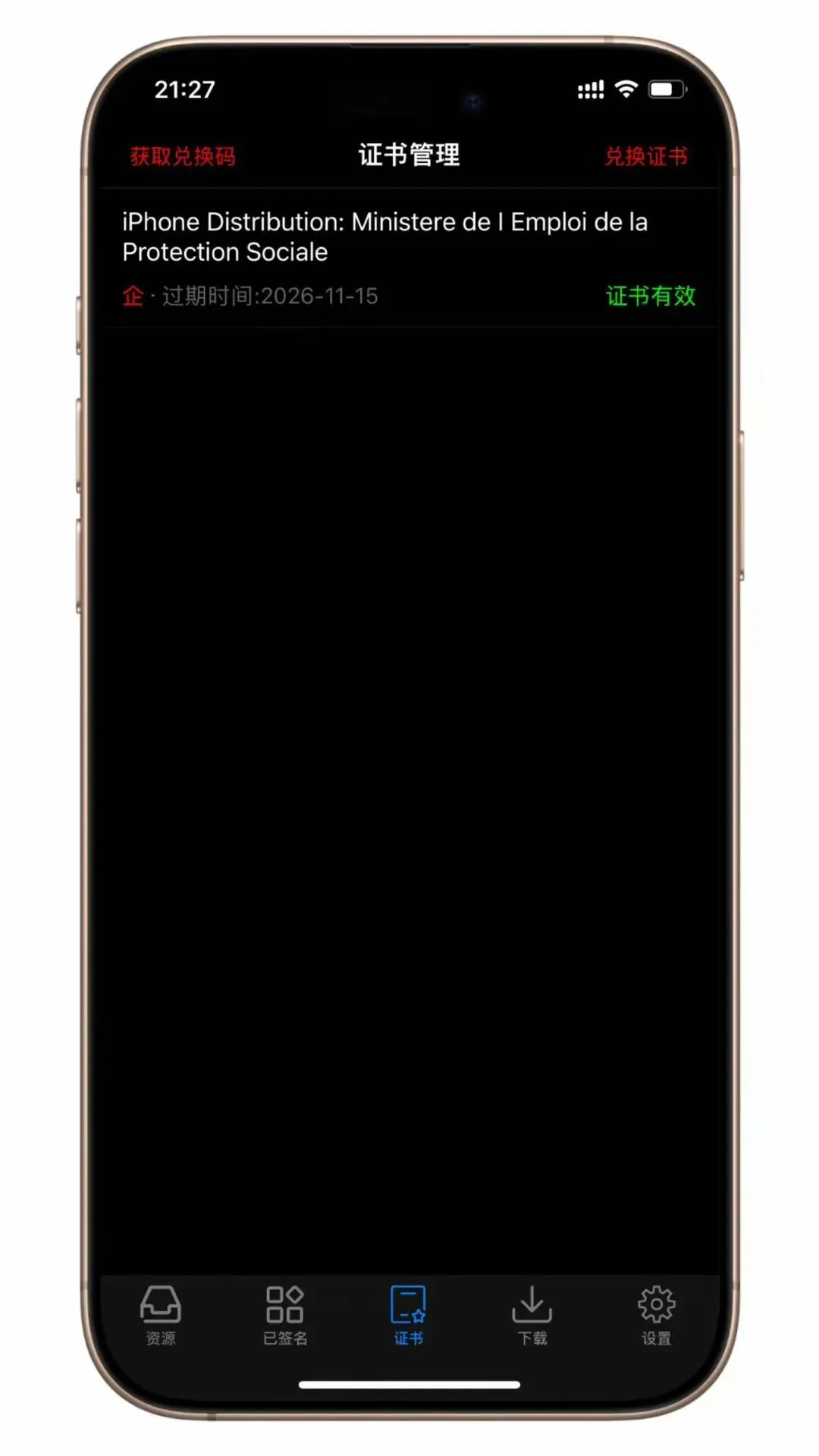 开全能签点击底部右侧设置-导入文件,输入密码将刚才的证书再次导入一次,然后点击底部证书,此时查看证书有效期,显示有效即可正常使用