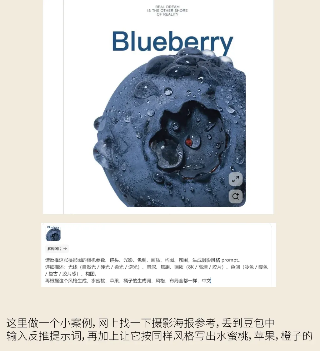 把蓝莓海报丢进AI工具,输入「摄影类反推指令」,AI会自动拆解核心风格(不用自己动脑!):