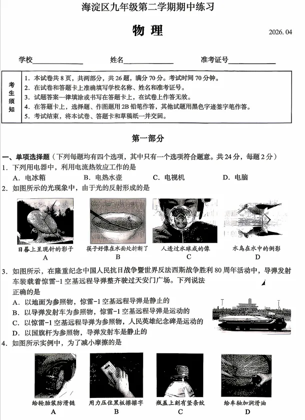 小编整理了2026年北京市海淀区初三一模物理,PDF版!可以参考练习。